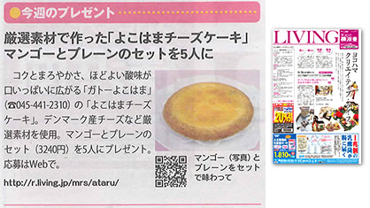 2014年7月24日号の『LIVING (横浜南)』(サンケイリビング新聞社発行)の”今週のプレゼント”では、ガトーよこはまの厳選素材で作った「よこはまチーズケーキ」のマンゴーとプレーンのセットを5人にプレゼント!