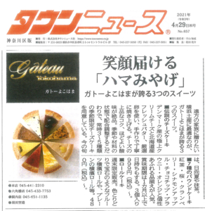 2021年(令和3年)4月29日のタウンニュース神奈川区版に『笑顔届けるハマみやげ』として、ガトーよこはまのチーズケーキ、パウンドケーキ、ロールケーキが紹介されました。