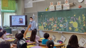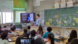 2021(令和3)年10月14日幸ヶ谷小学校に出前授業に行きました。コロナ禍なので、工場見学の代わりに、小学校教室とガトーよこはまの工場をリモートで繋ぎ、リアルタイムでケーキのできる様子を見てもらいました。