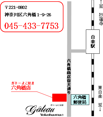 店舗のご案内 トップページ 店舗のご案内 六角橋店 六角橋店 所在地 横浜市神奈川区六角橋1-9-26 TEL 045-433-7753 営業時間 11:00~19:30 定休日 年中無休(元旦のみ休業) 六角橋商店街イベントでの割引あり Google Mapで見る > 本店 六角橋店 関内店 羽田空港第1 ピア5売店 羽田空港第2 フードプラザ店